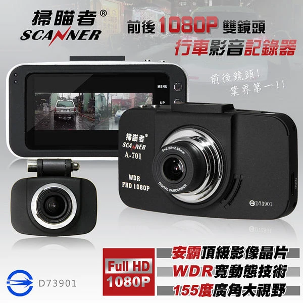 前後雙鏡頭可錄製 1080P 高解析影像。 採用安霸最頂級 A7L 晶片。 WDR 寬動態功能,強光抑制低光補強錄影效果。 採用 F2.0 大光圈超廣角鏡頭。 155 度超寬廣角,擋風玻璃前方畫面完全入鏡。 內建 G-Sensor,碰撞自動錄影鎖檔。 支援按鍵手動錄影鎖檔功能。 內建智能充電迴路,支援同時充電及錄影。 專利兩用式主機固定支架。 (吸盤或雙面膠固定)錄影亮度手動可調。(EV-2.0 ~ EV+2.0)內建高感度麥克風,可手動選擇開或關。 支援 HDMI 影像輸出功能。(*HDMI連接線請自行添購) 最高可支援 32GB Micro SD 記憶卡。 |